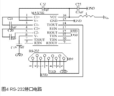 程序存储器阵列可以按两种模式之一来编程:一种是串行下载(在线编程)模式;另一种是并行编程模式。并行编程模式与常规的第三方提供的闪速或EEPROM器件编程器完全兼容,但应用起来较复杂,需要对ADUC812中支持并行编程所需的外部引脚进行配置。所以,在本模块的开发和调试过程中采用的是串行下载模式。作为工厂引导代码的一部分,ADUC812本身具有在线编程的程序,使经过标准UART串行接口实现串行代码下载变得容易,只需通过一个与地相连的1kΩ电阻将ADUC812的/PSEN引脚拉至低电平,那么上电时器件将自动进入串行下载模式。本系统使用图4的RS-232接口电路,从而实现上位机与ADUC812的串行接口通信。