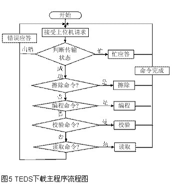 本系统的TEDS下载程序是RS232串行通讯程序,分为单片机程序和上位机程序两部分组成。这里研究单片机程序的开发。PC机和单片机之间要实现串行通信,除了要遵守RS232串行通讯协议外,还必须具有各自的通信应用软件。通信软件的设计思路是:PC机为主动方式,在通讯开始后由PC机向单片机发送请求,单片机返回应答信号,通讯正常后,单片机根据PC机发送来的命令,执行相应功能并应答。单片机流程图如图5。