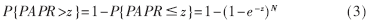 峰均比超过某一门限值z的概率,即互补累积分布函数(CCDF)是最常用来衡量PAPR减小技术的一个指标,PAPR的CCDF表示数据块PAPR大于某一给定门限的概率,假设OFDM符号周期内每个采样值之间是不相关的,则OFDM符号周期的N个采样值当中每个样值的PAPR都大于门限的概率,即得到OFDM系统的PAPR分布: