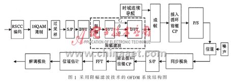 信号预畸变方法对OFDM信号中幅度超过门限的部分进行限幅,但是限幅使OFDM信号产生失真,频谱的带外辐射分量较大,前切后需要滤波,滤除谱的带外分量,滤波后又会使OFDM信号的PAPR回升,同时接收端误比特率(BER)上升,因此,选择适宜的限幅失真处理流程及滤波模型至关重要。