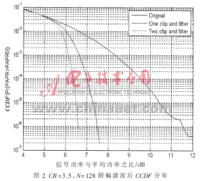 使用MATLAB对本文所提出方案降低OFDM系统性能进行仿真分析。其中OFDM信号采用16QAM调制方式。图2和图3显示了在子载波数N=128、数据子载波为100,及CR=3.5或CR=4的情况下的仿真结果。可以看出采用限幅滤波算法可以有效降低PAPR,虽然滤波会导致峰值再生,但比限幅前的信号峰值要小得多,并且随着限幅滤波次数的增大,显著降低了信号的PAPR值,每次限幅滤波过程都能进一步改善信号的PAPR特性。当CR=4、CCDF=10-5时,系统两次限幅滤波后的PAPR=7 dB,而CR=3.5、CCDF=10-5时,系统两次限幅滤波后的PAPR=6.4 dB。