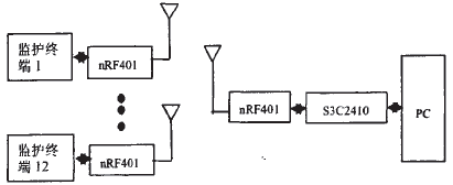 该遥测心电监护仪可同时监护1~12个床位.系统结构框图如图1所示.其中与PC机相连的S3C2410A作为中心躲护端.其功能是传递由PC机发出的命令,与监护各个床位的监护终端进行通信,将各个临护终端所采集到的数据汇总到中心监护端,并通过USB口传递给Pc机。监护一个床位的便携式心电监护终端作为终端节点,功能是采集心电信号,对采集到的数据进行必要的处理,同时当收到中心监护端的命令时,做出回应。