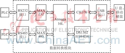 系统由数据输出终端为PLC、数据转换模块、数据接收终端(U盘、移动硬盘等)三部分组成。其中数据转换模块的中央控制器为Atmega16L单片机。此外,还包括由RS232和RS485组成的串口通信模块、CH376文件管理控制芯片、USB接口输出模块以及DS1302授时模块。PLC通过RS232或RS485接口将数据上传给单片机,单片机发送识别信号给接USB口模块,根据反馈信号判断USB接口连接是否正常,若正常则根据DS1302授时模块、利用CH376文件管理控制芯片在存储设备中新建以时间信息为文件名主体的txt文件类型或其他类型的文件,再将数据存入其中。系统整体结构如图1所示。