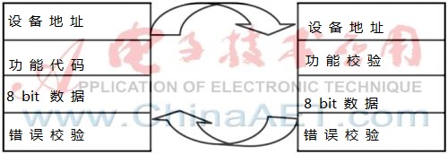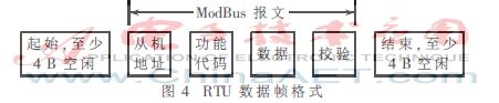 为了满足不同的PLC使用,本系统选用工业中使用广泛的ModBus通信协议。ModBus协议系统中有两种传输模式:ASCII模式和RTU模式。本系统的数据格式为RTU模式,在同样的波特率下,它可比ASCII方式传送更多的数据[6]。ModBus信息以帧的方式传输,在RTU模式中,每帧开始和结束都至少需要传输4 B数据的静止时间,所传输的报文数据域依次为从机地址、功能代码、数据和校验,传输的数据都是十六进制的[7]。RTU数据帧格式如图4所示。