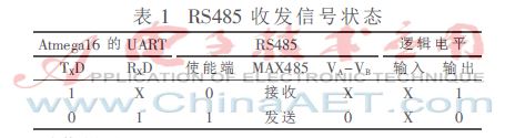 (2)发送状态:TXD为高,MAX485使能端为低,MAX485处于接收状态,由于偏置电阻R2、R3的作用,输出逻辑为高;TXD为低,MAX485使能端为高,MAX485处于发送状态,输出逻辑为低[5]。这样就实现了发送功能。RS485收发信号状态如表1所示。