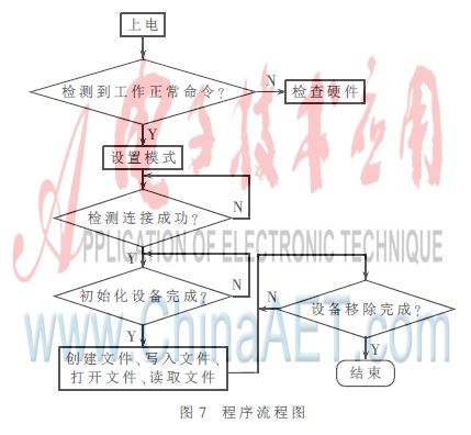 上电延时50 ms,单片机发送 CMD_CHECK_EXIST(06H)命令,发送55H数据,正常工作返回0AAH;再发送 CMD_SET_USB_MODE(15H)命令,后续数据为06H,设置为USB模式,返回状态为CMD_RET_SUCESS(51H),设置成功;发送CMD_DISK_CONNECT(30H)命令,检测U盘或移动硬盘是否连接,返回中断状为USB_INT_CONNECT(15H),设备连接;发送 CMD_DISK_MOUNT(31H)命令,初始化U盘或移动硬盘,产生中断返回USB_INT_SUCESS(14H),初始化完成。初始化完成即可对连接的U盘或移动硬盘进行创建新的文件、打开已有文件、写入数据等操作。操作完成后,发CMD_DISK_CONNECT(30H)命令,检测设备是否依然连接,产生中断。如果返回中断状态为USB_INT_DISCONNECT(16H),则设备移除;如果返回中断状态为 USB_INT_CONNECT(15H),则继续等待[3]。其流程如图7所示。