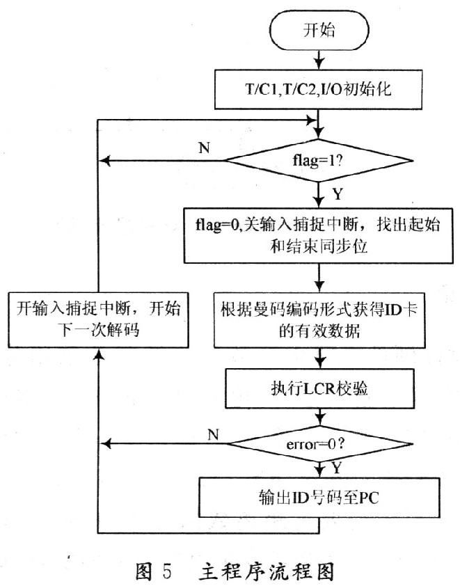 由曼彻斯特编码特点可知,每位数据都由半个周期的高电平和半个周期的低电平组成,因此可将一个位数据拆分为两位,即位数据“1”可视为“10”,位数据“O”可视为“01”,则64位数据可视为由128位组成。为了获得完整且连续存放的64位ID信息,在此接收两轮完整的64位数据,即接收256位。则上一轮接收到的停止位后紧跟着的必然是本轮接收到的起始位,据此找出起始同步头。再根据曼码特点获得ID卡的有效数据(“10”解码为“1”;“01”解码为“O”)并进行LCR校验,若校验无误,则将ID卡号输出至PC机,并准备下一次的解码;否则,直接准备下一次解码。另外,在程序中首先定义一个数组bit[256]用来存放接收到的数据;定义一个变量flag用来标记256位数据接收完成;定义一个变量error用来标记校验有错误产生。由于无ID卡靠近读卡器的有效工作区时,单片机输入捕捉引脚输入的是高电平,因此在主程序中先设定为下降沿触发,清零计数器TCNTl,打开T/C1的输入捕捉功能。主程序流程图如图5所示。