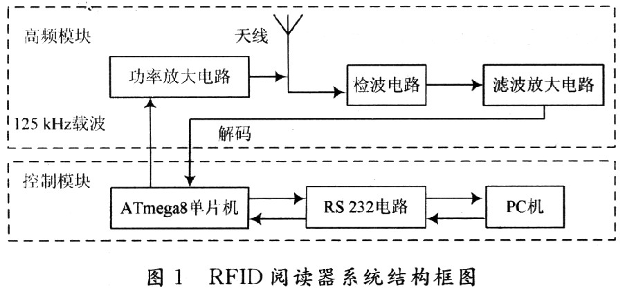 (1)阅读器:读取或读/写电子标签信息的设备,主要任务是控制射频模块向标签发射读取信号,并接收标签的应答,对标签的标识信息进行解码,将标识信息连带标签上其他相关信息传输到主机以供处理。一台典型的阅读器包含有高频模块(发送器和接收器)、控制单元以及与应答器连接的耦合元件。此外,许多阅读器还有附加的接口(RS 232,RS 485等),以便将所获得的数据传输给另外的系统(如个人计算机),其系统结构框图如图1所示。