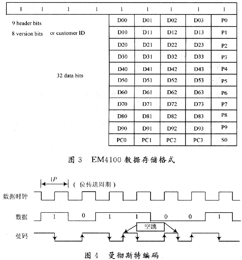 图3是EM4100的64位数据信息,它由5个区组成:9个引导位、10个行偶校验位“PO~P9'’、4个列偶校验位“PC0~PC3”、40个数据位“D00~D93”和1个停止位S0。9个引导位是出厂时就已掩膜在芯片内的,其值为“111111111”,当它输出数据时,首先输出9个引导位,然后是10组由4个数据位和1个行偶校验位组成的数据串,其次是4个列偶校验位,最后是停止位“0”。“D00~D13”是一个8位的晶体版本号或ID识别码。“D20~D93”是8组32位的芯片信息,即卡号。