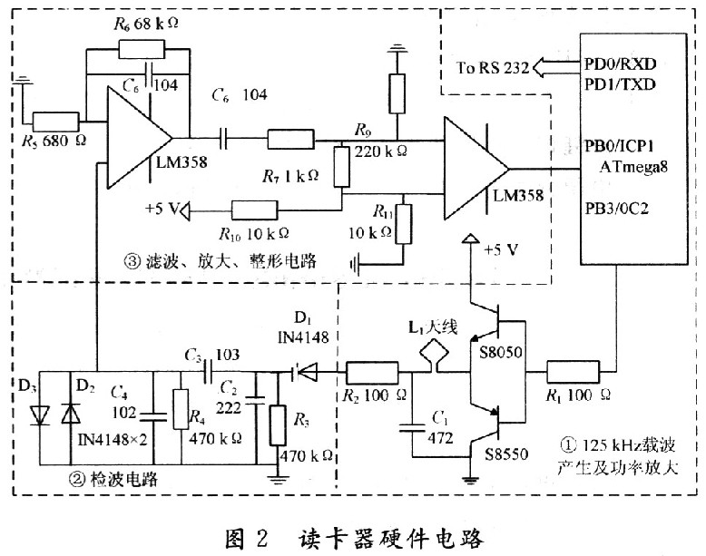 kHz载波信号,还原出有用数据信号。R2,D1,R3,C2构成基本包络检波电路,C3为耦合电容,R4,C4为低通滤波电路,D2,D3为保护二极管,输出接到滤波放大电路。③为滤波放大电路,滤波放大电路采用集成运放LM358对检波后的信号进行滤波整形放大,放大后的信号送入单片机的定时/计数器T1的输入捕捉引脚ICPl,由单片机对接收到的信号进行解码,从而得到ID卡的卡号。