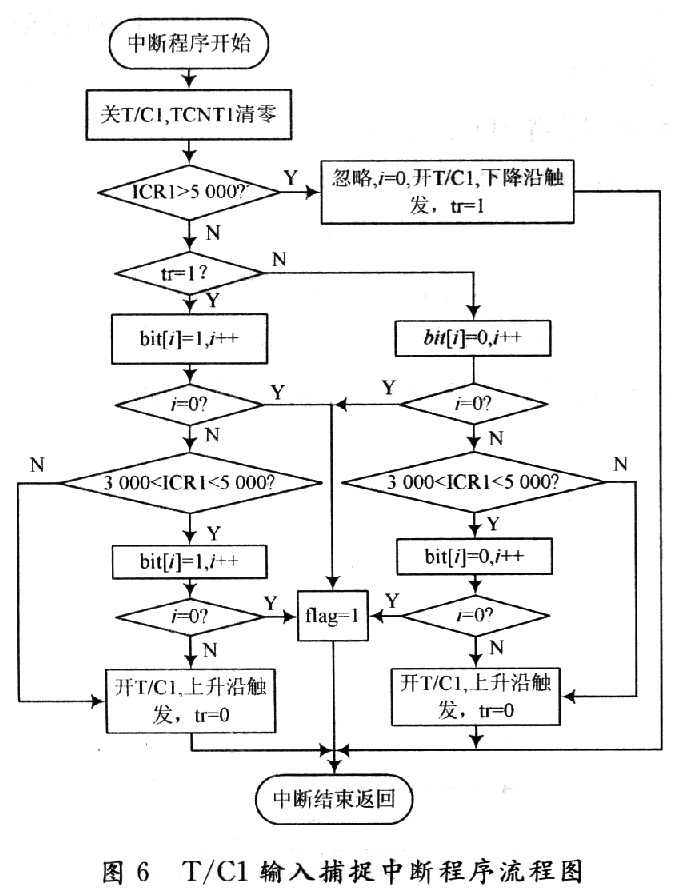 在输入捕捉中断程序中定义一个触发沿标志tr=1(用于表示由下降沿引起的触发),同时定义一个无符号字符型变量i用来对接收到的数据个数进行计数,由于无符号字符型数据的取值范围为O~255,所以当接收完256位时,i的值再次变为0。接着判断是否为合法跳变,由以上分析可知,电平跳变的时间为256μs或512μs为合法跳变。本系统使用8 MHz时钟,T/C1设置为无预分频,则系统周期为O.125μs,则256μs对应计数值应为2 048,512μs对应计数值应为4 096。取计数值TCNTl小于5 000为合法跳变依据,若TC-NTl大于5 000,则认为是由干扰信号产生的非法跳变,并将其忽略,取TCNTl介于3 000~5 000之间为512μs跳变依据。若为合法跳变,由于是下降沿触发的中断,则认为接收到一位数据“1”;若为合法跳变且3 000<TCNTl<5 000,则认为接收到两位数据“1”。