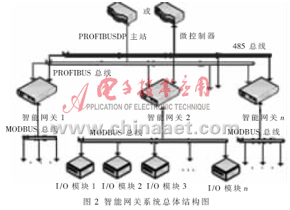 应用本网关所组成的系统总体结构如图2所示。智能网关在系统中无缝连接PROFIBUS-DP(以下简称”DP”)现场总线系统与MODBUS总线系统,实现同一系统内两种总线设备的共存。