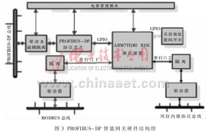 电源管理模块负责整套系统的电源供给,系统的稳定运行与电源模块的稳定性能关系密切,此处设计的电源模块兼有热插拔和电压转换功能;DP从站模块的核心功能由协议芯片(VPC3+C)实现;中央管理模块除了实现对DP从站模块的配置和管理,还要完成MODBUS协议的实现以及两种协议数据交换协议栈的实现。