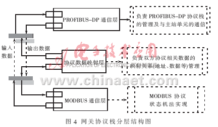 网关协议栈是连接MODBUS输入/输出模块与DP通信的桥梁。协议栈分为DP通信层、协议数据映射层和MODBUS通信层三层。网关协议栈分层结构及各层功能如图4所示。