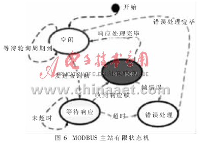 为提高信号传输的距离及抗干扰能力,此处MODBUS物理层采用标准RS485通信。为了保证MODBUS协议软核的健壮性,设计了其有限状态机[1]模型,如图6所示,并根据此有限状态机模型运用状态路由器进行软件实现。