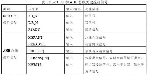因为AHB 总线和CPU 的传输协议不同,所以需要匹配两个接口的时序,以保证CPU与其他外围IP 可以通过总线正常通信。相关接口控制信号如表1 所示。
