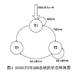 T1:根据MIO 信号判断当前CPU 是否需要访问外围I/O。如果8086 处理器核访问的是存储器单元而不是AHB 总线上的设备(即MIO 为1),状态机则保持T1 状态,并且不向AHB 总线发出总线请求信号(即HBUSREQ 信号置为0)。MIO 为低电平则跳转到T2。