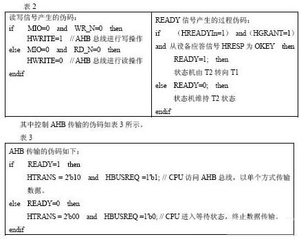 8086 处理器核的读写信号受READY 信号控制,当READY 信号为高电平时,可进行数据的接收和发送,否则读写信号保持。READY 信号由AHB 总线上从设备传输完成信号HREADYIn、AHB 总线允许信号HGRANT 以及从设备应答信号HRESP 三者共同决定。而总线上的读写控制信号HWRITE 由组合逻辑产生。其产生过程伪码如表2 所示。