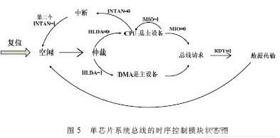 DMA 扮演从设备的角色,接受CPU 对其的初始化;利用HLDA 作仲裁信号,当CPU 响应外设DMA 请求时(即HLDA 为高电平),让出总线控制权给外设,利用DMA 数据通道传输数据,传输的协议同样遵从AMBA 协议。总线的时序控制模块状态如图5 所示。