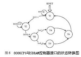 在各种随机存储器件中,SDRAM 的价格低,体积小,速度快,容量大,是比较理想的器件。但SDRAM 的控制逻辑比较复杂,对时序要求也十分严格,这就要求有一个专门的控制器:控制SDRAM 的初始化,刷新和预冲以及基本的读写操作。同时,需要匹配SDRAM控制器和8086 CPU 的读写时序。该接口具体实现的状态机如图6 所示。