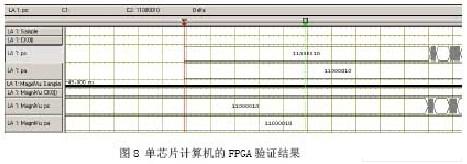 使用Quartus II 软件成功编译设计,将布局布线生成的结果下载到FPGA 中,得到与设计等效的实际电路,对实际的电路用测试系统进行测试,从而验证设计的正确性。将FPGA的验证结果经逻辑分析仪读取显示,如图8 所示。