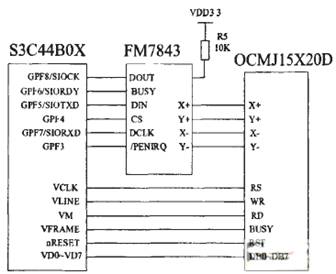 OCMJ15x20D 模块内置LCD控制器,并将触摸屏安装在LCD液品屏上,设计相应的控制电路对LCD和触摸屏控制。当用户操作触摸屏时,模块FM7843控制芯片对触摸点进行检测,并把检测到的信息送出转换为相应的坐标,以供S3C44BOX处理器读取。