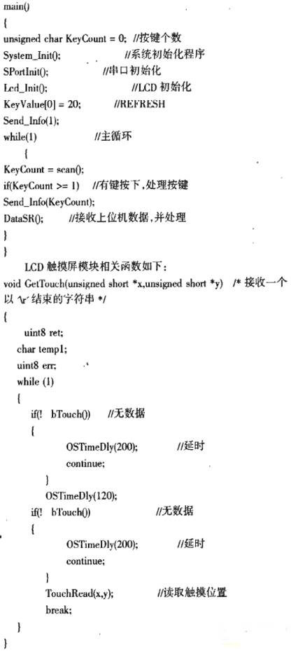 本系统显示部分采用的是OCMJ15x20D (320x240点阵)D系列中文液晶湿示模块,其中OCMJ表示奥可拉中文集成模块。这是一个中英文文字与绘图模式的点阵液晶屁示模块,内建 512KByte的ROM字形码,可以显示中文字型、数字符号、英日欧文等字母,并且内建双图层(Two Page)的显爪内存。在文字模式中,可接收标准中文文字内码直接显示中文,而不需要进入绘图模式以绘图方式描绘中文,提升液晶显示中文之效率。该模块整合了多项的实用界面,包含内建的10-Bit ADC.提供触控屏接口。OCMJ15X20D(V3.2)的触摸屏是用FM7843控制的,该控制器已集成在模块上,模块已留出FM7843的控制线供客户使用(OCMJ15X20D上的J5脚),可直接使用3V供电而不需外接负电压。