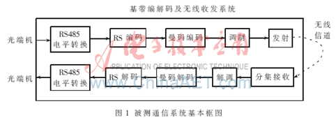 本文所设计的误码测试仪主要用于测试某通信系统的误码性能。该通信系统是一个庞大复杂的系统,本文主要介绍信道部分,包括基带的信道编解码和无线信道的收发,其基本框图如图1所示。