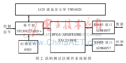 本系统用单片机作为主控芯片,由FPGA完成误码测试的工作,将得到的误码信息传送给单片机,单片机进行误码率的计算后送液晶屏进行显示。m序列的发送和接收都是通过RS485接口进行的。本系统单片机选用的是51系列的STC89LE58RD+,3.3 V供电,可以减小系统功耗。FPGA选用了Xilinx公司的SPARTNANII-E系列的XC2S300E,其内部包括了30万个逻辑门和其他丰富的资源,可以满足本系统的需要。RS485接口芯片选用Analog Device公司的ADM4857,它是一款10 Mb/s码率、全双工的485接口芯片[3-4]。系统的硬件框图如图2所示。