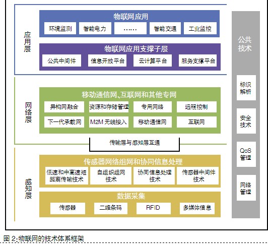 物联网的技术体系框架如图2所示,它包括感知层技术、网络层技术、应用层技术和公共技术。