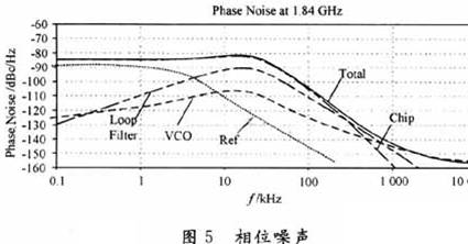 采用ADISimPLL软件对该方案进行了仿真分析,图5给出仿真结果。可以看出,该频率合成器的相位噪声为-84.63 dBc/