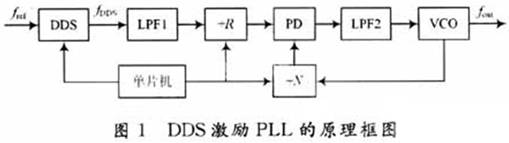 DDS直接激励PLL的频率合成技术,与单纯的PLL技术相比,作为参考源的DDS具有很高的频率分辨率,可以在不改变PLL分频比的情况下,提高PLL的频率分辨率,而且采用DDS激励PLL设计方法的电路结构简单,所用硬件少,通过合理设计环路滤波器可以较好地改善因PLL倍频作用而恶化的相位噪声。系统原理框图如图1所示。