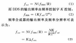 图1中,fref是参考信号,一般由高稳定度的晶体振荡器产生,用于保证DDS各个部件的同步工作。fDDS取代原有的晶振作为锁相环(PLL)的激励源,其输出fDDS频率取决于频率控制字K。频率合成器的输出由VCO提供,PLL芯片中电荷泵的输出由低通滤波器(LPF2)产生,用于控制VCO的输出频率。DDS中K和PLL的分频比可以通过单片机中的控制程序加以改变,从而实现频率合成。
