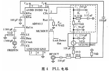 PLL电路如图4所示,该电路由性价比很高的锁相芯片ADF4113、滤波电路、VC0构成。设计中采用DDS输出取代原有的晶振,为GSM系统提供13 MHz的激励源,信道频率间隔为200 kHz,基准输入需经ADF4113中的基准分频器完成65分频。