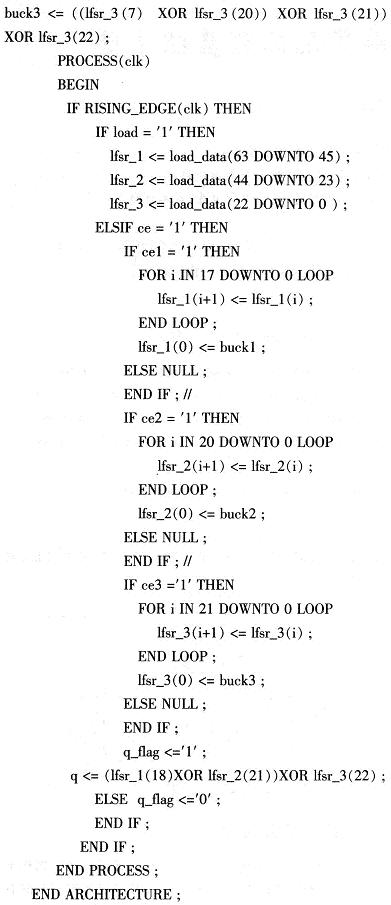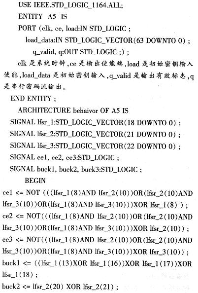FPGA采用CycloneII系列中的EP20F256C6,该器件是低成本架构FPGA,可提供多达18 752个逻辑单元.152个用户IO,239 616 bit的存储位,密度超过CycloneI FPGA的3倍,完全满足系统设计需要。CycloneII FPGA内部的逻辑资源可实现复杂应用。CycloneII器件采用的低成本串行配置器件,这种串行配置器件最大可提供64 Mbit的nash存储器。所以,采用EP20F256C6可高效完成系统核心算法,有效节约成本。其内部算法由VHDL语言编程实现。主要程序模块:加解密算法模块(A5/1和W7)、数据存储模块、同步产生模块、同步检测模块。加密和解密各有一套独立的模块集合。其中A5/1算法模块的VHDL代码如下: