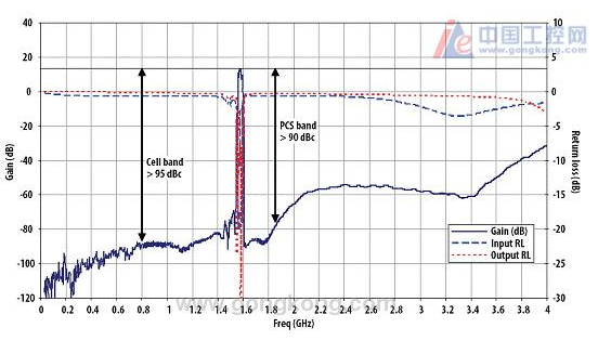 下面是市场常见的两个型号的主要指标,在低噪放都采用CaAs E-pHEMT工艺的情况下,不难看出FBAR滤波器对PCS频段的抑制比SAW高出21dB( 63 vs. 42)