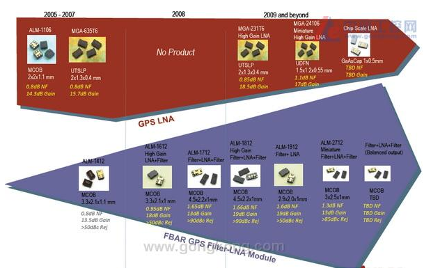 附图1:Avago科技GPS接收前端产品发展线路图