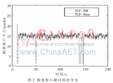在上述仿真环境下比较TCP-BM协议和TCP Reno协议拥塞窗口随时间的变化情况,结果如图2所示。