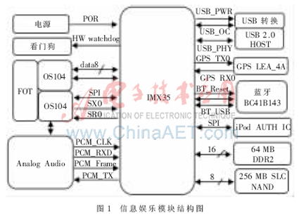 系统采用飞思卡尔IMX35处理器,该处理器基于ARM11TM核心技术,高性能、低功耗、面向数据连接和多媒体而设计,可满足当前多媒体应用的各种需求。本系统通过蓝牙与带有蓝牙功能的手机相连实现免提通话,能够播放插入系统U盘中的多种格式的音频文件,车载GPS为驾驶者提供导航信息。通过MOST总线将车内功放、DVD机连接,传输音频、视频及控制命令等信息。信息娱乐模块的结构图如图1所示。