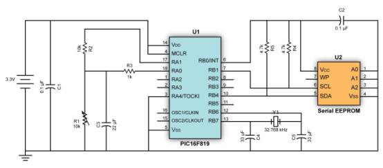 图1:在该医疗数据记录器应用中,MCU的I/O引脚可以用于对EEPROM和传感器供电。