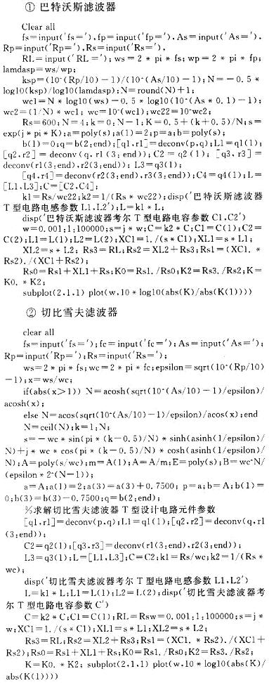 运用Matlab语言进行编程计算出如图1所示巴特沃斯T型和∏型电路图的电路元件参数。图2为切比雪夫T型和∏型电路图的电路元件参数。