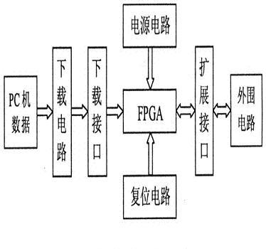 本设计的开发板电路包括6个部分:下载电路、下载接口、FPGA、电源电路、和扩展接口。其电路结构框图如下: