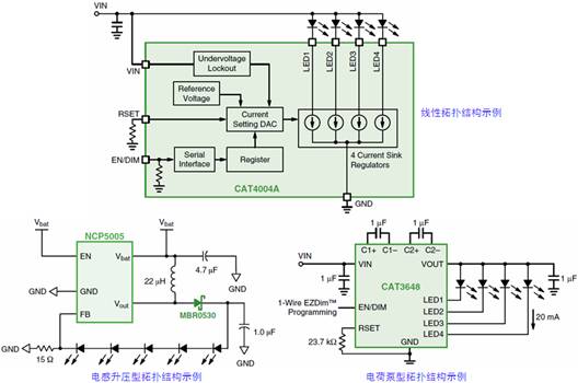 图1:低压便携设备应用的不同LED驱动器拓扑结构示例