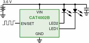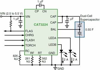 图3:业界首款单芯片4 A超级电容LED驱动器CAT3224应用电路图。