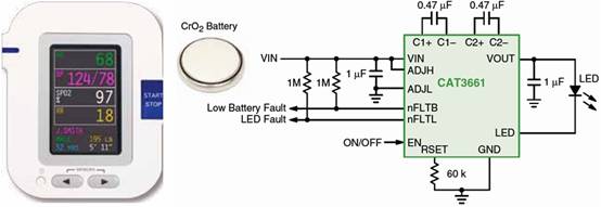 图4:针对扣式电池优化的CAT3661 LED驱动器应用电路图。