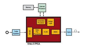 如Xilinx Virtex-5 FPGA这样的最新器件拥有大量的逻辑应用,能提供类似于ASIC级的性能。FPGA囊括了广播设备设计人员想要的所有功能:嵌入式低功耗3.2Gbps收发器;支持多种标准(如SDI、HD-SDI、双连接HD-SDI、3G-SDI、DVB-ASI、AES数字音频)、以太网和PCI Express接口、高速DSP模块、嵌入式处理器、以太网MAC、PCI Express核、多个视频IP核。