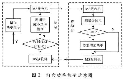 前向功率控制指基站根据移动台的测量结果调整对每个移动台的发射功率的控制。基站周期性的发送测试移动台检测前向传输的误帧率,并向基站报告该误帧率的统计结果。基站根据移动台报告的误帧率统计结果,决定增大或是减小前向传输功率。在基站系统缓慢减少移动台的前向链路发射功率过程中,当移动台检测到误帧率(FER)超过预定义值时,请求基站系统增大前向链路发射功率。每隔一定时间进行一次调整,用户终端的报告分为定期报告和门限报告。其控制过程如图3所示。