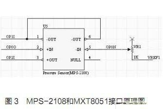 对于血压信号的感知,可采用Metrodyne Microsystem公司的MPS-2108传感器。它在血压计、数字压力计及医疗设备领域的广泛应用已表明其可以胜任本文所要设计的功能。MPS-2108传感器和MXT8051的接口原理图如图3所示。