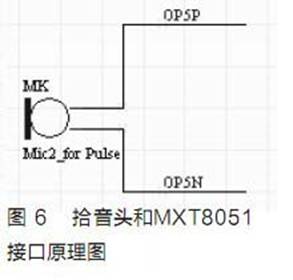 对于脉搏信号的感知,选取普通的拾音头MIC即可感知脉搏音信号,将采集到的模拟信号通过片上运算放大器交由MXT8051处理。拾音头与MXT8051的接口原理图如图6所示。