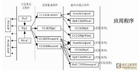 对构件化系统以及底层硬件抽象构件和各具体芯片研究分析可知,系统集成构件都是起到上述作用,同时又引入新的问题。若开发人员对硬件抽象构件熟悉,就完全可以跨过系统集成构件而直接使用硬件抽象层提供的构件。这样就简化了原方案中系统集成构件之间繁杂的调用关系,更重要的是可以大大提高系统的运行效率,还以CC2420系统集成构件为例,其改进后的构件调用方案如图4 所示:
